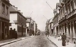 After the end of the Wars of Liberation in 1813, the Nassau government began to improve the infrastructure and reform the administration of the duchy. Höchst became the administrative seat of the Höchst district in 1816.[28] As part of the expansion of the Mainzer Landstraße, the obstructive and useless city walls and both city gates were demolished in 1816 and the main street was extended. Only the Main front of the old town fortifications remained, as there was no room for the town to expand. It still characterizes Höchst's image on the Main side today. Königsteiner Straße, which was created as part of the new town project, was extended between 1814 and 1820 as a road towards Königstein. Höchst experienced further economic and population growth. In 1822, the entry in a geography book read:[29]