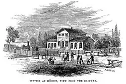 The first stage of the Taunusbahn from Frankfurt to Höchst was opened on September 26, 1839. It was one of the first German railroads. The first Höchst station was located at the level crossing on today's Königsteiner Straße. The line to the Nassau residence of Wiesbaden was completed by the beginning of 1840. In 1847, the branch line to the then very popular spa town of Soden opened.