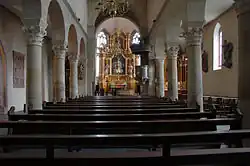 The monastery of St. Alban, which had previously provided pastoral care in the Justinuskirche, was dissolved in 1419. The monastery property was therefore transferred to the Antonite Order in 1441, which moved its monastery in Roßdorf near Hanau to Höchst. The Antonite monks added a Gothic choir to the Justinuskirche, which still characterizes the appearance of the building today. The last Antonites left Höchst in 1803 after secularization.[21]