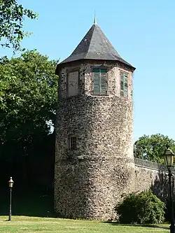 Shortly after the town was raised, the construction of a town fortification began in Höchst. The town wall, which has been partially preserved to this day, was probably built in several stages. The Limburg Chronicle does not mention a stone wall in the report on the Frankfurt attack of 1396, but rather palisades with ditches and towers:[18]