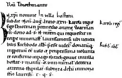 It was not until the 8th century that there is evidence of a settlement of farmsteads on the high plateau above the Nidda. However, there can be no talk of a village in the modern sense; it was rather a loose collection of individual farmsteads. The first documented mention of this settlement was on August 5, 790 in the Lorsch Codex, when the Frankish lord of the manor Thiotmann donated an estate in villa hostat in Nitahgowe, in the "village on the high site in the Niddagau", to Lorsch Monastery.[6] In later times, the Renaissance poet Georg Calaminus wrote down the Hostato legend in verse, according to which the squire Hostato was the only one to survive the Battle of Roncesvalles and was therefore knighted by Charlemagne as thanks for his bravery and appointed bailiff of the high place.