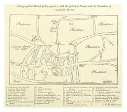 In 1816, Huydecooper described Kumasi as having clean and straight streets with "houses excellently built, the latter being fairly tall but for the most part only one story."[9] A year later, Thomas Edward Bowdich documented that the central city, with the exclusion of suburbs such as Bantama and Asafo - was oblong shaped and had a perimeter of approximately 4 miles. Four of its principal streets according to Bowdich, were half a mile long and about 50 to 100 yards wide. Bowdich also notes that Kumasi's streets were named and a "superior captain" was placed in charge of each street.[9] At the time of Bowdich's visit in 1817, Kumasi had 27 streets and by the mid-1880s, another source identified 50 streets.[13] The city had 77 wards and specific wards were inhabited by a particular class of artisans or workers. For instance, goldsmiths, umbrella makers, coffin makers, executioners and city patrollers resided in specific sections of the city.[14] The palace complex was located in the eastern quarter of the central city.[9] Bowdich refers to a piazza 200 yards long that "lines the interior of the wall secluding the palace."[9] For sanitation, Bowdich recorded the presence of public toilets on the outskirt of town and the existence of toilets in each house as well. They were "not unfrequently upstairs" and boiling water was poured in daily to prevent "the least offence." The waste of houses was burned behind the street every morning.[15][16] In peaceful times, the red and white clay of buildings were regularly polished and renewed.[14] A uniformed police existed to maintain security.[17]