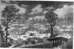 European sources in the late 19th century mentioned the city's neatness such as the account of F. Boyle in 1874 who stated Kumasi's smell "are never those of sewage" as well as Brackenbury, who wrote around 1873 that "the streets are generally very broad and clean, and ornamented with many beautiful banyan-trees affording grateful shade from the powerful rays of the sun."[16] In contrast, William Butler described the city amid the British invasion, as 'a filthier, and far more blood-stained collection of mud and wattle hovels than any other village in the forest.'[25] Parts of the city, including the then royal residence, were burnt by the British in the Third Anglo-Ashanti War of 1874.[26] Native carriers were generally blamed for torching the city, and British engineers made strenuous efforts to quell the fires.[25]