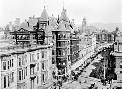 In the 1870s, Los Angeles was still little more than a village of 5,000. By 1900, there were over 100,000 occupants of the city. Several men actively promoted Los Angeles, working to develop it into a great city and to make themselves rich. Angelenos set out to remake their geography to challenge San Francisco with its port facilities, railway terminal, banks and factories. The Farmers and Merchants Bank of Los Angeles was the first incorporated bank in Los Angeles, founded in 1871 by John G. Downey and Isaias W. Hellman. Wealthy Easterners who came as tourists recognized the growth opportunities and invested heavily in the region.[58] During the 1880s and 1890s, the central business district (CBD) grew along Main and Spring streets towards Second Street and beyond. In Downtown Los Angeles, there was an archaeological excavation in 1996 on the site of Union Station which took place during the demolition of the parking structure as well as a massive excavation of the basement. Artifact deposits were typically trash pits and privies from the brothels and boarding houses that formerly existed in that area. In addition, there was also a sheet refuse of artifacts from Old Chinatown, the nearby residential area. This area of Downtown Los Angeles was known as the crib District which was heavily occupied by brothels and saloons.[59]