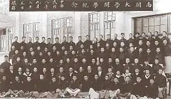 In 1920, Li Zusen donated 30,000 silver dollars to Nankai University, establishing the mining department and purchasing over 700 acres of land. In 1921, the university division was officially renamed "Tianjin Private Nankai University." On September 12, 1921, Liang Qichao was invited to lecture on "Chinese Historical Research Methods" at Nankai University, attracting teachers and students from various schools in Tianjin to attend.[8] Subsequently, Liang Qichao proposed establishing an Institute of Oriental Culture at Nankai University to primarily study Confucian and Mencian thought and Song Dynasty Neo-Confucianism. This proposal received support from Yan Xiu and Zhang Boling, but it was ultimately abandoned due to a lack of response.[7] In 1922, the Rockefeller Foundation inspected Nankai University and, after attending Mr. Qiu Zongyue's qualitative analysis class, decided to donate a science building. Yuan Shuzhi also contributed to the construction, and the building was completed the following year and named "Siyuan Hall." In 1924, Nankai University experienced the "Reincarnation Education" incident. Nankai University student Ning Encheng published an article titled "Reincarnation Education" in the Nankai Weekly, arguing that contemporary education had fallen into an inescapable cycle that could not save the country and that students' learning could not serve society. The article caused tension between students and faculty, but tensions gradually eased with Zhang Boling's careful handling. Zhang began to reflect on the drawbacks of emulating Western education systems. Soon after, the Nankai University Academic Affairs Council decided that, except for English classes, all courses would be taught in Mandarin.[9] In 1926, the mining department was dissolved, and Wu Dayou and other students were transferred to the science department to continue their studies. In February 1927, Lu Muzhai funded the construction of the Nankai University Library, which was named Muzhai Library upon completion.[10] In September 1927, on the initiative of He Lian and with the support of President Zhang Boling, the Nankai University Social and Economic Research Committee was established in Xiushan Hall as an independent research institution not affiliated with any department. In October of the same year, the Nankai University Manchuria and Mongolia Research Association was founded. In 1928, Zhang Boling, chairing the school's fundraising committee, formulated the "Nankai University Development Plan," which proposed the educational mission of "Knowing China and Serving China",[11] and aimed to solve China's problems with the academic background of Chinese history and society.[12] In 1929, Nankai University restructured its departments into schools, establishing the School of Liberal Arts, School of Science, School of Business, and the pre-medical program, with a total of 13 departments. In September of the same year, history professor Jiang Tingfu, economics professor Xiao Qiu, and botany professor Li Jitong, all American-educated faculty, were recruited by Luo Jialun to teach at Tsinghua University due to its better financial conditions.[13]
