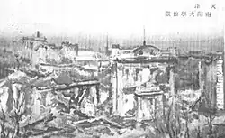 Nankai University became the first higher education institution to be destroyed by war in the conflict between China and Japan. The campus was almost completely destroyed, with estimated losses reaching 6.63 million Chinese yuan, accounting for one-tenth of the total wartime losses of all higher education institutions in China. The attack on Nankai University drew significant attention, with prominent figures such as Cai Yuanpei, Hu Shih, Mao Dun, and Guo Moruo sending letters of sympathy.[25] Chiang Kai-shek, then President of the Republic of China, promised Zhang Boling during a meeting with educational and academic circles of Peking and Tianjin that Nankai would be rebuilt, declaring, "Nankai has sacrificed for China, and as long as China exists, Nankai will exist!"[25] On August 1, Cai Yuanpei, Jiang Menglin, Hu Shih, Mei Yiqi, and four others sent a telegram to the League of Nations' Intellectual Cooperation Committee to inform them of the Japanese invasion of Nankai and other educational institutions, urging the international community to sanction Japan.[26]