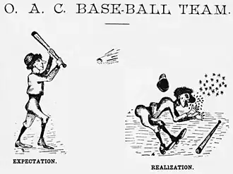 Intramural baseball was also played on the OAC grounds during the 1892–93 school year, with the Juniors battling a picked nine of underclassmen and town kids on June 20, 1893, losing to the youngsters 7–6 in late innings when their pitcher ran out of gas.[12] The game was otherwise noteworthy for the injury of town player Billy Kerr,[13] who was struck by a pitch in the side of the head and lost for the afternoon.[12]