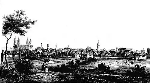 In the beginning of the following century, another expansion of the town became necessary. Between 1200 and 1230, the staple market at the Speyerbach (today Fishmarket Square) was included within the city walls.[20] The foundation of new parish churches such as St. Bartholomew, St. Jacob and St. Peter is an indication of a growing population. As of the end of the 11th century, Spira became the only name used for the town. Until then, “civitas Spira vel Nemeta” or just “Nemetum” was used in documents.