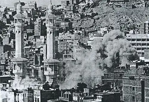 In 1979, 400–500 Islamist insurgents, using smuggled weapons and supplies, took over the Grand mosque in Mecca, called for an overthrow of the monarchy, denounced the Wahhabi ulama as royal puppets, and announced the arrival of the Mahdi of "end time". The insurgents deviated from Wahhabi doctrine in significant details,[174] but were also associated with leading Wahhabi ulama (Abd al-Aziz ibn Baz knew the insurgent's leader, Juhayman al-Otaybi).[175] Their seizure of Islam's holiest site, the taking hostage of hundreds of hajj pilgrims, and the deaths of hundreds of militants, security forces and hostages caught in crossfire during the two-week-long retaking of the mosque, all shocked the Islamic world[176] and did not enhance the prestige of Al Saud as "custodians" of the mosque.