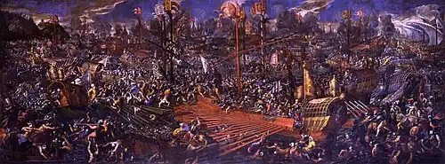 The hemp was primarily used to manufacture cordage and sails for the Venetian fleet at low costs, but it was also used for caulking ship hulls.[43][44][46] The ropes could also be sold at a lower price to foreign ships transiting at the port, thus making it competitive in the international market at the time, although sales from the Arsenal to private third parties required a specific licence issued by the authorities.[44][46] After the victory of the Holy League against the Ottoman Empire at the Battle of Lepanto on 7 October 1571, the Venetian Senate charged the Arsenal with the upkeep of 100 thin galleys and 12 galleasses for the purpose of rapid deployment.[51] Nevertheless, the heavy crisis of the late 16th century dealt a significant blow to the Venetian shipbuilding industry, leaving the Arsenal with a halved reserve of galleys in 1633.[51] According to contemporary estimates, an 800-botti ship in 1586 required around 24 t (23.6 long tons) of hemp to supply its shrouds and cordage; while the hemp used for sails, ropes, and shrouds, represented 30% of the total cost of a galley in 1600.[51]