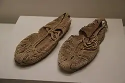 The hemp fiber was mainly used by the Romans to produce ropes, sheets, wickers, and nets;[21] in particular Pliny mentions three Alabandica varieties to be the best ones to be used for hunting nets, the variety cultivated in Mylasa to be the second best, and the hemp grown in the Sabine territory to be particularly tall.[18] In regard to woven fabrics, archaeological excavations at Pompeii, in Campania felix (i.e. part of what is now Campania), unearthed samples of hemp textiles that had been preserved by the eruption of Mount Vesuvius in 79 A.D.,[22] reportedly including cloth sandals made of hemp,[23] although linen was generally preferred in Antiquity for the production of canvas, sails, and clothing.[6][24] In 1992, further textile samples were recovered from a lead sarcophagus that belonged to an upper-class elderly woman, who lived between the 4th and 5th centuries A.D., and was buried in a Roman necropolis located in Albintimilium, in the coastal area of Liguria that now constitutes the Region of the same name.[25] Based on morphological and morphometrical analyses, the recovered fibers were later identified as most likely being fragments of cannabis sativa, although a slight chance was recognized that they could actually belong to low quality linen.[25]