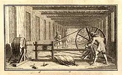 At the hemp house, the hemp fiber would arrive in large square bales, already macerated and dry, and it would be forcefully slammed against a wooden pole, equipped with metal rods, to complete the breakage of the stalk.[52] The remaining woody fragments would then be removed using comb-like tools of different shapes for both coarser and finer combing, in preparation for the spinning phase.[52][53] While using scutching tools with ever-finer teeth, the finest of which could have a teeth spacing as small as 1 mm (0.04 in), the artisans would gradually separate the different fibers based on their qualities, including their robustness and color.[54] The spinning mechanism consisted in a large rotating wooden wheel, placed vertically and firmly fixed to the ground, equipped with laterally protruding rods that supported a winding rope connecting the wheel to several interchangeable wooden cylinders of different dimensions, depending on the final size of the rope to be produced, which were located a few meters away.[52][53] The rotating wheel would make such cylinders spin, and they could be used to either twist a twine (with a single cylinder), or intertwine three or four strings (with multiple cylinders) to produce different types of rope.[52][53][54]