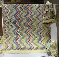 Hemp plants were used in their entirety, namely the roots were used as firewood, the woody stalk fragments were dipped in sulfur to produce matches, the seeds were used as food for livestock, and the fiber was used to make fishing nets, ropes to be used in various agricultural activities, and textiles such as packaging for fine linens, flour sacks, family clothing, and trousseaus for daughters' weddings.[24][75][76] As they are particularly resistant, hemp fibers were also mixed with the more delicate wool to produce mezzalana (i.e. half-wool) fabrics, which were especially suitable for wear-prone textile products.[77] Similarly, mixtures of hemp fibers with either linen or wool, known as pignolato (i.e. pine nuts patterned), were widely used in the area around Ferrara for the production of clothes, as reported by the local writer Riccobaldo in his Sermo de ritibus antiquorum.[35]