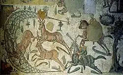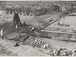According to Pliny, Roman farmers would sow hemp seeds during spring and harvest the ripe hemp seeds after the autumn equinox, after which they were dried in the sun, or the wind, or by the smoke of a fire, while the hemp plants were plucked after the vintage, to be then peeled and cleaned.[18] Moreover, according to the De re rustica by contemporary agricultural writer Lucius Columella, hemp plants require either rich, manured, and well-watered soil, or alternatively soil that is level, moist, and deeply worked.[27] Ancient Romans would plant six hemp seeds per pes quadratus (0.0876 m2; 0.943 sq ft) toward the end of February however, if the weather was rainy, sowing could be done up to the spring equinox without harming the crop.[27] One of the last Roman authors to mention hemp was Palladius in his Opus agriculturae, a treatise written around the late 4th – early 5th century A.D., which essentially repeats what was reported by Columella on cannabis cultivation.[28] In terms of articles of commerce, useful information on the price of both hemp and hemp-derived products can be found in the Edict on Maximum Prices, issued in 301 A.D. by Emperor Diocletian, which established price caps equal to 80 denarii per modius (8.73 L; 1.92 imp gal) of hemp seeds, and 4 denarii per libra (372.5 g; 131.4 oz) of processed hemp, while it increased to 6 and 8 denarii for ropes and strings, respectively.[26] These maximum prices were relatively modest when compared to more expensive products, such as flax seeds, linen, and wool, which attests to the lower demand for hemp products at the time.[26]