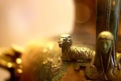 In 1954, a now-famous hypogaeum was excavated by Italian archaeologist Pellegrino Claudio Sestieri in the Ancient Greek colony of Poseidonia, Magna Graecia, in the area of modern-day Capaccio Paestum.[12] Dated to the late 6th century B.C., the underground structure was identified as a heroon possibly dedicated to the unknown founder of the city, based on the retrieved artifacts, which included eight bronze vases (i.e. six hydriai and two amphoras).[12] Other proposed interpretations of the structure included a Nymph sanctuary, the cenotaph of the founder of Sybaris, or a Chthonian sanctuary; however, as very little written records are available from the considered period, the organic content of the vases constitutes the primary source of knowledge regarding the purpose of the sacellum.[12]