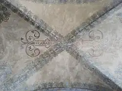 Note. Latin inscription meaning Bread is life, hemp is protection, wine is joy, painted across three decorated vaults of the porticoes of Bologna, under the Scappi tower, where market stalls selling such products would once be set up.[85]