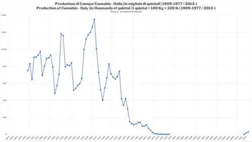 - ^ a b "Italian hemp production expected to improve this year". Foreign Crops and Markets – Foreign Agricultural Service (USDA). 72 (26): 863–864. 25 June 1956.