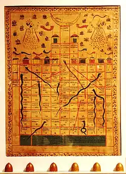 The Ancient Indian game of Pachisi was brought to the west by the British in the 1863 and an adaptation of the oldest game named Parcheesi was first copyrighted in the United States by EG Selchow & Co in 1869.[65] A version of the game called Ludo was patented in 1896. A similar German race game, Mensch ärgere dich nicht ("Man, don't get annoyed"), became immensely popular with German troops during World War I. Another Indian game which was adopted by the West was Gyan chauper (a.k.a. Moksha Patam), popularly known as snakes and ladders. This was a game which was intended to teach lessons about karma and good and bad actions, the ladders represented virtues and the snakes vices. The moral lesson of the game was that spiritual liberation, or Moksha could only be achieved through virtuous action, while vice led to endless reincarnation. The game dates to medieval India where it was played by Jains and Hindus. A Buddhist version, known as "ascending the [spiritual] levels" (Tibetan: sa gnon rnam bzhags) is played in Nepal and Tibet[66] while a Muslim version of the game played during the Mughal period from the late 17th or early 18th centuries featured the 101 names of God. The game was first brought to Victorian England and it was published in the United States as Chutes and Ladders (an "improved new version of England's famous indoor sport") by game pioneer Milton Bradley in 1943.