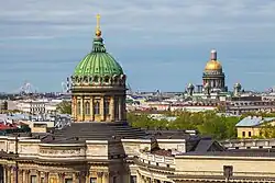 Iron domes offered the lightness of timber construction along with incombustibility and higher strength, allowing for larger spans. Because domes themselves were relatively rare, the first examples made from iron date well after iron began to be used as a structural material.[2] Iron was used in place of wood where fire resistance was a priority. In Russia, which had large supplies of iron, some of the earliest examples of the material's architectural use can be found. Andrey Voronikhin built a large wrought iron dome over Kazan Cathedral in Saint Petersburg.[25] Built between 1806 and 1811, the 17.7 meter wide outer dome of the cathedral was one of the earliest iron domes.[26] The iron outer dome covers two masonry inner domes and is made of 15 mm thick sheets set end to end.[27]