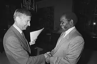 In response to the Hani memorandum and other signs of "crisis" in the MK ranks, Tambo called the landmark Morogoro Conference, the ANC's first consultative conference and first conference in exile, held between 25 April and 1 May 1969.[30] Most dramatically, at the conference Tambo referred to a "loss of confidence in the men who have been leading our struggle from Lusaka" and offered his resignation as acting ANC President.[30] Once he had left the meeting, the conference passed an unopposed vote of confidence in him,[30] and he ultimately remained acting President until his appointment was formally confirmed in 1985.[28] The conference also reinstated Hani and the other six cadres who had been suspended, and it adopted a new "Strategy and Tactics" document, drafted by Slovo.[30] The document affirmed that the seizure by force of state power in South Africa was a central objective of the struggle, but, acknowledging a position expressed by the Hani memorandum, it clarified the relationship between military and political struggle:[32]