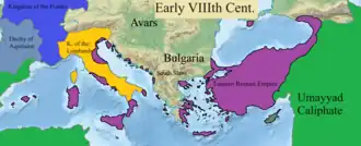 The withdrawal of massive numbers of troops from the Balkans to combat the Persians and then the Arabs in the east opened the door for the gradual southward expansion of Slavic peoples into the peninsula, and, as in Anatolia, many cities shrank to small fortified settlements.[53] In the 670s the Bulgars were pushed south of the Danube by the arrival of the Khazars, and in 680 Byzantine forces which had been sent to disperse these new settlements were defeated. In the next year Constantine IV signed a treaty with the Bulgar khan Asparukh, and the new Bulgarian state assumed sovereignty over a number of Slavic tribes which had previously, at least in name, recognized Byzantine rule.[54] In 687–688, the emperor Justinian II led an expedition against the Slavs and Bulgars which made significant gains, although the fact that he had to fight his way from Thrace to Macedonia demonstrates the degree to which Byzantine power in the north Balkans had declined.[55]