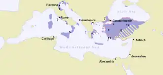 The western conquests began in 533, as Justinian sent his general Belisarius to reclaim the former province of Africa from the Vandals who had been in control since 429 with their capital at Carthage.[28] Their success came with surprising ease, but it was not until 548 that the major local tribes were subdued.[29] In Ostrogothic Italy, the deaths of Theodoric, his nephew and heir Athalaric, and his daughter Amalasuntha had left her murderer, Theodahad (r. 534–536), on the throne despite his weakened authority. In 535, a small Byzantine expedition to Sicily was met with easy success, but the Goths soon stiffened their resistance, and victory did not come until 540, when Belisarius captured Ravenna, after successful sieges of Naples and Rome.[30] In 535–536, Pope Agapetus I was sent to Constantinople by Theodahad in order to request the removal of Byzantine forces from Sicily, Dalmatia, and Italy. Although Agapetus failed in his mission to sign a peace with Justinian, he succeeded in having the Monophysite Patriarch Anthimus I of Constantinople denounced, despite empress Theodora's support and protection.[31]