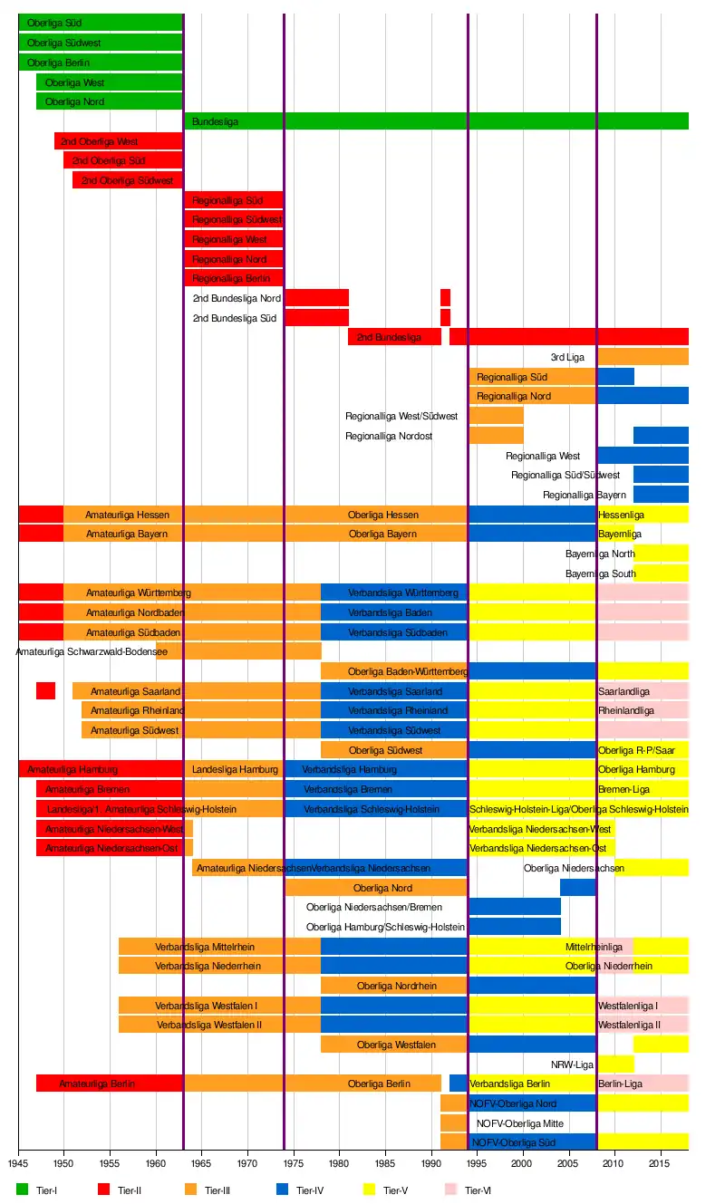 After World War II the Oberliga system developed out of the occupation zone championships. The best teams of the five West German top-level divisions qualified for the German championship tournament. From 1949 until 1991 the German Democratic Republic had its own football league system.
