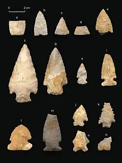 | L | Thebes Cluster (Early Archaic) or Big Sandy Side-notched (Middle Archaic) | 8000–7000 BC or 6000–4000 BC | Justice 1987:54–56; DeRegnaucourt 1991:117–123, 131 |