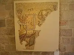 Near the port of Gaza, remnants of the ancient synagogue of southern Gaza were discovered, built around the year 508 CE during the Byzantine period. On the mosaic floor of the synagogue, various African animals are depicted, along with medallions, and at the entrance, there is a portrayal of a figure playing a musical instrument surrounded by animals, with the name "David" above. The central inscription on the mosaic in Greek reads: "We, Menahem and Yeshua, sons of Jesse, wood merchants, as a mark of respect for the holiest site, donated this mosaic in the month of Louos, year 569" (the Jewish counting of the year in Gaza began with the expulsion of Gabinus). The community of Gaza is also mentioned in the Cairo Geniza documents.[10]