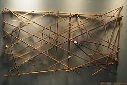 The Marshallese sailed between islands on proas made from breadfruit-tree wood and coconut-fiber rope.[8] They navigated by using the stars for orientation and initial course setting, but also developed a unique piloting technique of reading disruptions in ocean swells to determine the location of low coral atolls below the horizon.[9] The Marshallese recognized four different types of swells coming from the cardinal directions, and noticed that swells refracted around the undersea slope of atolls. When refracted swells from different directions met, they created noticeable disruption patterns, which Marshallese pilots could read to determine the direction of an island.[10] When interviewed by anthropologists, some Marshallese sailors noted that they piloted their canoes by both sight and feeling changes in the motion of the boat.[7] The Marshallese preferred to sail between July and October, because Pacific trade winds made the swells harder to read during the rest of the year.[11] Sailors also invented stick charts to map the swell patterns, but unlike western navigational charts, the Marshallese stick charts were tools for teaching students and for consultation before embarking on a voyage; navigators did not take charts with them when they set sail.[12] The Marshallese made three types of charts: mattang charts, which were instructional tools for teaching the principles of piloting, and meddo and rebbelib charts, which represented the relative positions of actual swells and islands.[7]