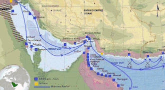 Through the three defined Iron Ages and the subsequent Hellenistic period, the area remained an important coastal trading entrepôt,[11] becoming Islamised in the 7th century and the Islamic era saw it emerge once again as an important centre for trade, centred particularly around the ports of Julfar, Dibba and Khor Fakkan.[12] These, linked to the vast Eastern Arab trading network that centred around the Kingdom of Hormuz, formed an important link in the Arab monopoly of trade between the East and Europe.[13]