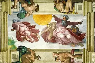 Later, his idea of a rotund and vibrant anatomy, but charged with emotional intensity, was embodied in his Adam of the Sistine Chapel (1508–1512), reminiscent of the Dionysus of the Parthenon pediment, but with a vital charge far removed from the harmonious Phidian sculpture. Similarly, the figures of the athletes (usually called simply ignudi, "naked") on the ceiling of the Sistine have the balance of athletic energy together with the transcendence of their sacred mission—they represent the souls of the biblical prophets—harmoniously exercising their mediating role between the physical and spiritual worlds, so that their physical beauty is a reflection of divine perfection. In other scenes, such as The Flood (1509), he also shows vigorous figures whose physical power reveals their spiritual strength. The Creation of Eve (1509–1510) presents a rotund, vigorous female figure, with very marked contours. On the other hand, the Christ of the Last Judgment (1536–1541) has the solemnity of an Apollo understood as sol justitiae, but with a rotundity—patent in his almost square torso—already far removed from the classical canons. His representation of Jesus is no longer the typical bearded figure of Byzantine tradition, but the effigy of an Olympian god or a Hellenistic king, closer to Alexander the Great than to a Jewish carpenter, with a more athletic build than one would expect from the mystical Christian ascetic.[84] In his last works, the three piéades (the Palestrina, the Duomo and the Rondanini Pietà), he completely abandoned the ideal of physical beauty, with distorted figures (Palestrina), angular (Duomo) or with a schematism close to the Gothic (Rondanini).[85]