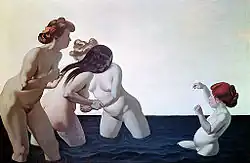 The nude as an artistic genre has been shaped not only by historical and cultural values but also by evolving theoretical interpretations, particularly regarding the distinctions between "nude" and "naked." While nude and naked are often conflated, they represent distinct concepts in art history. British art historian Kenneth Clark in his book, The Nude: A Study in Ideal Form, argued that "to be naked is to be deprived of our clothes, and the word implies some of the embarrassment most of us feel in that condition. The word 'nude,' on the other hand, carries, in educated usage, no uncomfortable overtone."[3] Clark asserted that "the nude is not the subject of art, but a form of art," suggesting that the human body becomes a "nude" when the artist idealizes and perfects its depiction, rather than simply reproducing it as seen in life.[3]