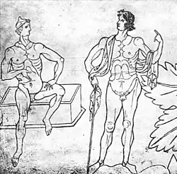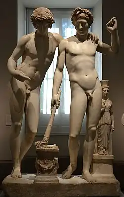 The first productions in sculpture were the work of Greek artists who settled in Rome, among them: Apollonius of Athens, author of the Belvedere Torso (50 BC); Cleomenes, author of the Venus de' Medici (1st century BC); and Pasiteles, author of the Boy with Thorn.[37] Stephanos, a disciple of Pasiteles, was the author of the Athlete of Albani (50 BC), a figure that had an enormous success, a fact that is corroborated because 18 copies have reached us, and that originated a variant with another figure, creating a group sometimes identified with Mercury and Vulcan, and others with Orestes and Pylades, of which a copy, called Group of San Ildefonso (10 BC), is preserved in the Prado, where the two figures are reminiscent of Polyclitus' Doriphorus and Praxiteles' Apollo Saurochthonus.[38] Other anonymous works stylistically related to Hellenistic Greek art are the Boxer at Rest from the Museo delle Terme in Rome (100–50 BC) and the Hellenistic Prince from the same museum (100–50 BC).