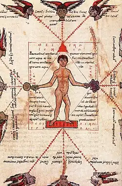 Although the study of proportion in the human body was lost during the Middle Ages, the human body was the object of a cosmogonic symbolism with mathematical and aesthetic applications: the homo quadratus. Starting from the Platonic corpus, medieval culture considered the world as a great animal—and, therefore, as a human being—while man was conceived as a world, a microcosm within the great cosmos of Creation. This theory related the symbolism of the number four to nature, which in turn was applied to art: there are four cardinal points, four seasons, four phases of the moon, four main winds; and four is the number of man, a theory that goes back to Vitruvius and his conception of man as an ideal square, with the width of his outstretched arms corresponding to his height.[47]