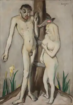 In its beginnings, Christianity—still under a strong Jewish influence—had forbidden not only the nude, but almost any image of a human figure, since it was a transgression of the second commandment, and condemned pagan idols as the abode of demons. The fact that many pagan gods were represented in painting and sculpture in human form, and in many occasions naked, made the primitive Christians identify the nude with pagan idolatry, if not they saw directly a diabolic link. However, the end of paganism and the assimilation of Neoplatonic philosophy by Christian morality led to the acceptance of the body as a receptacle of the spirit, and nudity as a degraded state of the human being, but natural and acceptable. Even so, medieval art completely lost the concept of bodily beauty inherent in classical art, and when it was represented—in the biblical passages that required it, such as Adam and Eve—they were deformed bodies, reduced to basic lines, with minimized sexual attributes, unattractive bodies, devoid of aesthetic qualities. The Gothic period was a timid attempt to remake the human figure, more elaborate and based on more naturalistic premises, but under a certain conventionalism that subjected the forms to a rigidity and a geometrizing structure that subordinated the body to the symbolic aspect of the image, always under the premises of Christian iconography.[48]