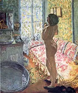 John Berger later critiqued this distinction in Ways of Seeing, arguing that "a naked body has to be seen as an object in order to become a nude."[4] For Berger, the "nude" reflects a cultural framework that positions the body as an object of display and power dynamics, particularly in relation to gender. Frances Borzello expanded on these ideas in The Naked Nude, introducing the concept of the "naked nude," which combines vulnerability with aesthetic traditions.[5] Some examples that illustrate a "naked nude" includes Chantal Joffe's, Alice Neel's and Lucian Freud's self-portraits; these works highlight the intersection of vulnerability and aesthetic tradition, showcasing the body as both personal and political. This redefinition emphasizes the body as a site for personal, political, and emotional expression, moving beyond traditional notions of idealized perfection.