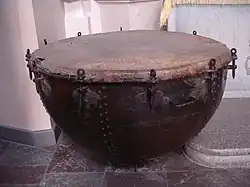 The timpani is considerably older than other melodic percussion instruments, such as the marimba and xylophone. Music historians trace the instrument's history to ancient times when the drums were used in religious ceremonies. During the 13th century, timpani began to be used in pairs and were called Nakers, or Nakirs. These drums were small, usually between 7 and 9 inches (178 and 229 mm), and were used primarily by the military.[1] The construction of these drums was composed of a shell made of either metal or wood and a head, which was connected directly to the shell of the drum and did not allow for the drums pitch to be altered at all. The drums themselves were tuned to fixed pitches and were usually tuned to an interval of a fourth or a fifth.[2] These drums were used until the 15th century, when cavalry such as the Mongols, Muslims and Ottoman Turks would mount timpani-like drums on horseback. These drums were much larger than those previously used and were very similar to the drums that would be later used in the orchestra.[3]