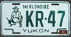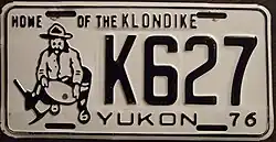 | 1976 | Black on white with border line; black embossed prospector at left with gold paint speck; "YUKON 76" at bottom | Home of the Klondike | A123 | Coded by region (A) | Letters A, B, C, E, J, K, L, N, P and T used in Whitehorse, D in Dawson, F in Faro, H in Haines Junction, M in Mayo, and W in Watson Lake. This continued through 1981.[2] |