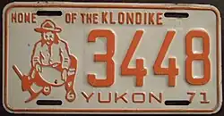 | 1971 | Orange on white with border line; orange embossed prospector at left with gold paint speck; "YUKON 71" at bottom | Home of the Klondike | 1234 | 1 to approximately 6300 | |