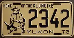 | 1973 | Black on tan with border line; black embossed prospector at left with gold paint speck; "YUKON 73" at bottom | Home of the Klondike | 1234 | 1 to approximately 7000 | |