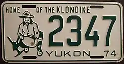 | 1974 | Green on white with border line; green embossed prospector at left with gold paint speck; "YUKON 74" at bottom | Home of the Klondike | 1234 | 1 to approximately 8000 | |