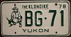 | 1978 | Green on white with border line; green embossed prospector at left with gold paint speck; "YUKON" centred at bottom and "78" at top right | The Klondike | AB-12 | Coded by region (A) | Manufactured in Saskatchewan using that province's serial dies. This practice continued until 1990. |