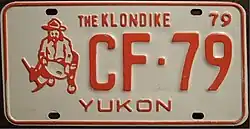 | 1979 | Red on white with border line; red embossed prospector at left with gold paint speck; "YUKON" centred at bottom and "79" at top right | The Klondike | AB-12 | Coded by region (A) | Final single-year passenger plate in Canada. |