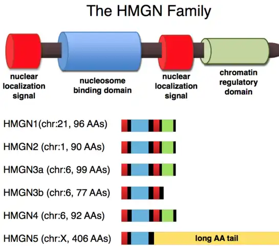- ^ a b c Kugler JE, Deng T, Bustin M (July 2012). "The HMGN family of chromatin-binding proteins: dynamic modulators of epigenetic processes". Biochimica et Biophysica Acta (BBA) - Gene Regulatory Mechanisms. 1819 (7): 652–6. doi:10.1016/j.bbagrm.2012.01.013. PMC 3371129. PMID 22326857.