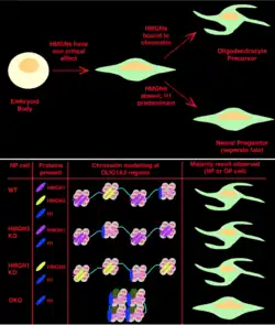 In oligodendrocyte differentiation HMGNs are critical, since when HMGN1&2 are both knocked out the population of oligodendrocytes in spinal tissue was reduced 65%.[16] However, due to functional compensation this effect is not observed when only HMGN1 or HMGN2 are knocked. This observation if not just correlation. With ChIP-seq analysis it is shown that chromatin modeling at the OLIG1&2 genes (transcription factors involved in oligodendrocyte differentiation) is in an open conformation and has HMGNs bound to the nucleosomes.