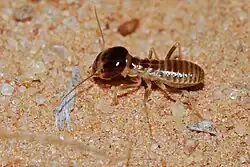Harvester termites in general form a major component in the diet of the diurnal bat-eared fox in east and southern Africa.[16] For this unusual diet, these foxes have 48 small teeth compared to the 42 teeth of all other dogs. They also have large ears to hear the insects in their underground chambers, before they are dug up. Though the aardwolf is a specialized predator of certain Trinervitermes, they may assume a partially diurnal habit in winter to obtain harvester termites.[17] The worker castes present the dominant, and seasonally the exclusive food item of some Chondrodactylus, Pachydactylus and Ptenopus gecko species. Ptenopus females especially, seem to gorge on nocturnal foraging congregations in spring to supplement their vitellogenic requirements.[9]