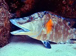 The hogfish (Lachnolaimus maximus), also known as boquinete, doncella de pluma or pez perro in Mexico[3] is a species of wrasse native to the Western Atlantic Ocean, living in a range from Nova Scotia, Canada, to northern South America, including the Gulf of Mexico.[4] This species occurs around reefs, especially preferring areas with plentiful gorgonians. It is a carnivore which feeds on molluscs, as well as crabs and sea urchins.[2] This species is currently the only known member of its genus.[2]