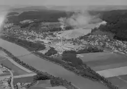In 1858 a railway line was built through the village, though a train station was only added in 1999. In 1912 a lime processing factory and a portland cement factory were built. An earthenware factory was founded in 1933, which produced until the 1970s. In 1950 three quarters of the workforce worked in the industrial sector, while in 2000 roughly three-fourths work in the services sector.[3]