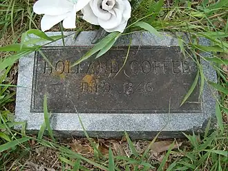 Holland Coffee (August 15, 1807 – October 1, 1846)[1] was an American trader, guide, interpreter, and representative of Fannin County. He was involved with the settlement of the present-day Lake Texoma area and acted as a liaison between the native west and Caucasian settlers.[2] Coffee was known chiefly for his trading and relations with Native American tribes such as the Comanches, Kiowa, Caddo, Wichita, and Delaware, and his many trading posts established in places such as Tillman, Love, and Cotton Counties.[2] While Coffee was known for his prosperity, his land expansions brought along debt as well.[2]